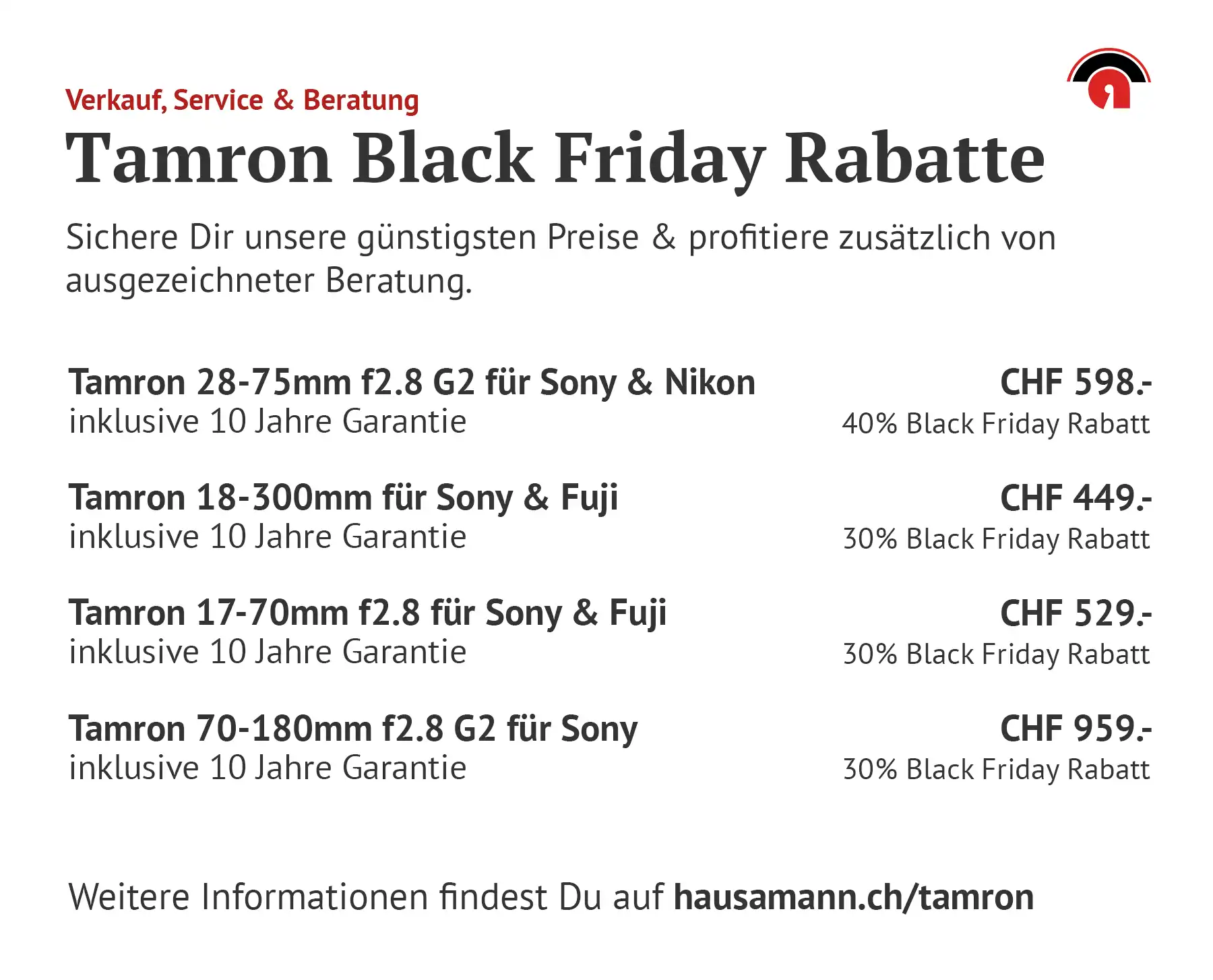Damit unsere Nikon und Fujifilm Fans nicht im Regen stehen, haben wir z. B. 30% Rabatt auf das Tamron 18-300mm Fujifilm oder 40% Rabatt auf das Tamron 28-75mm Nikon.