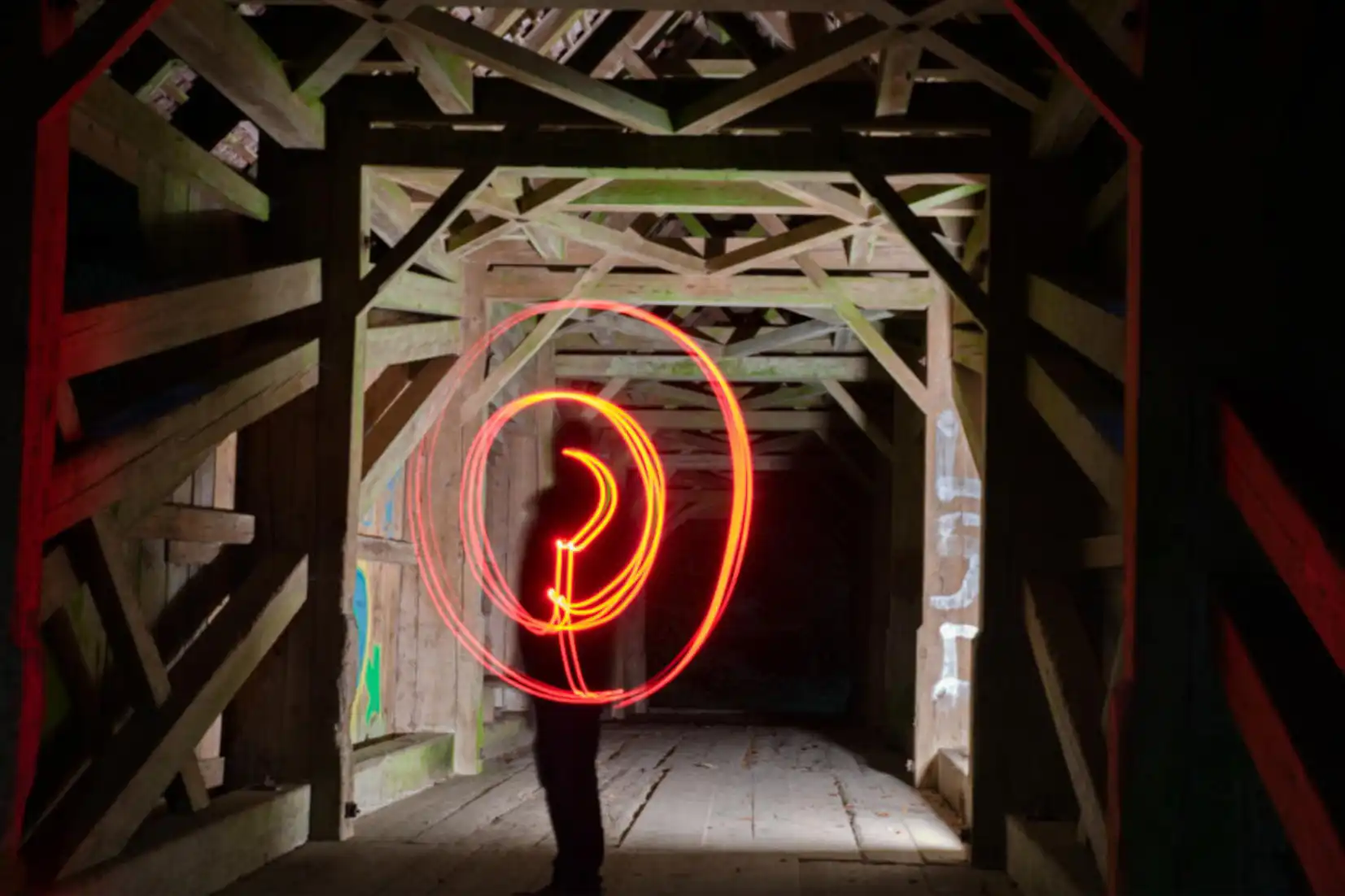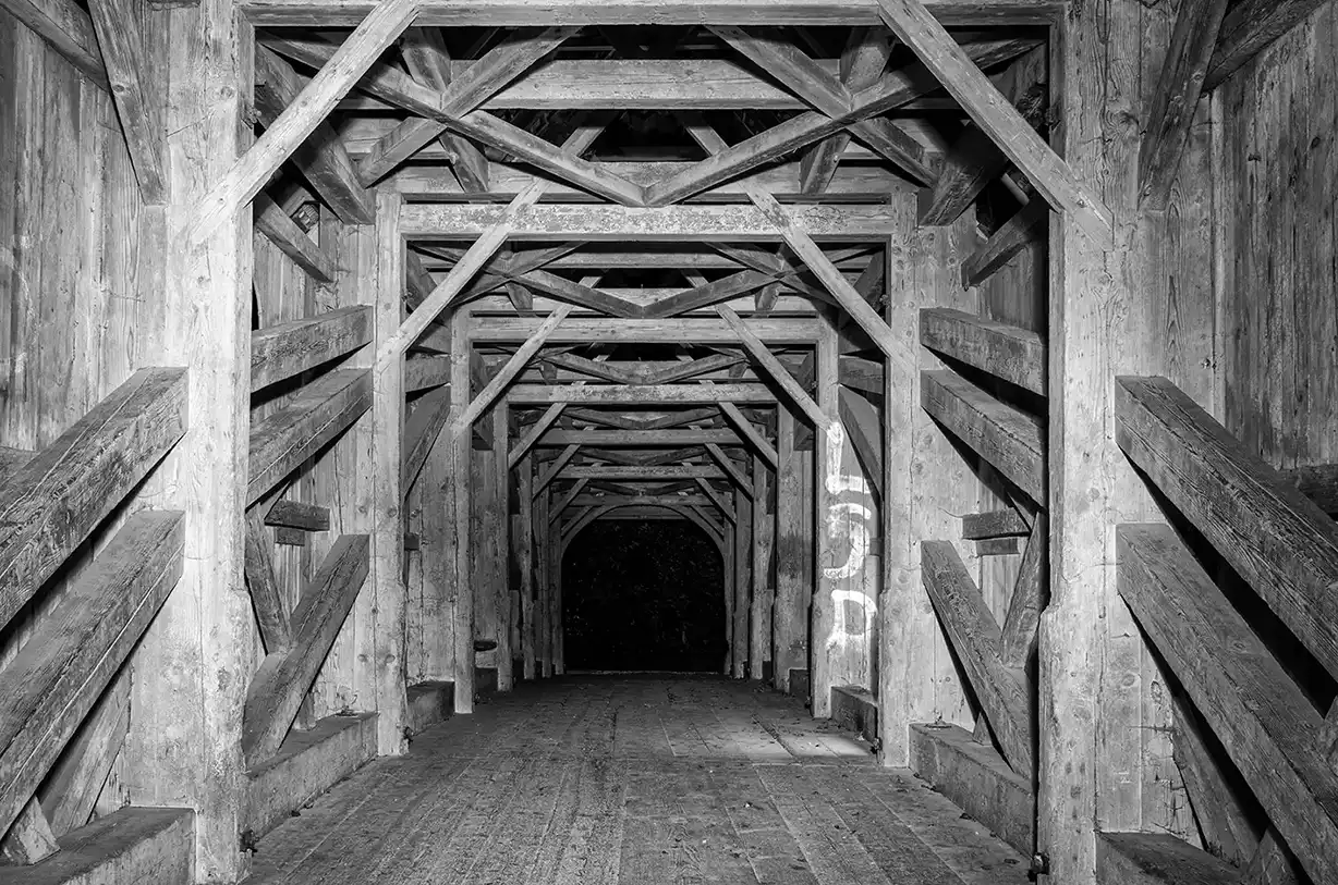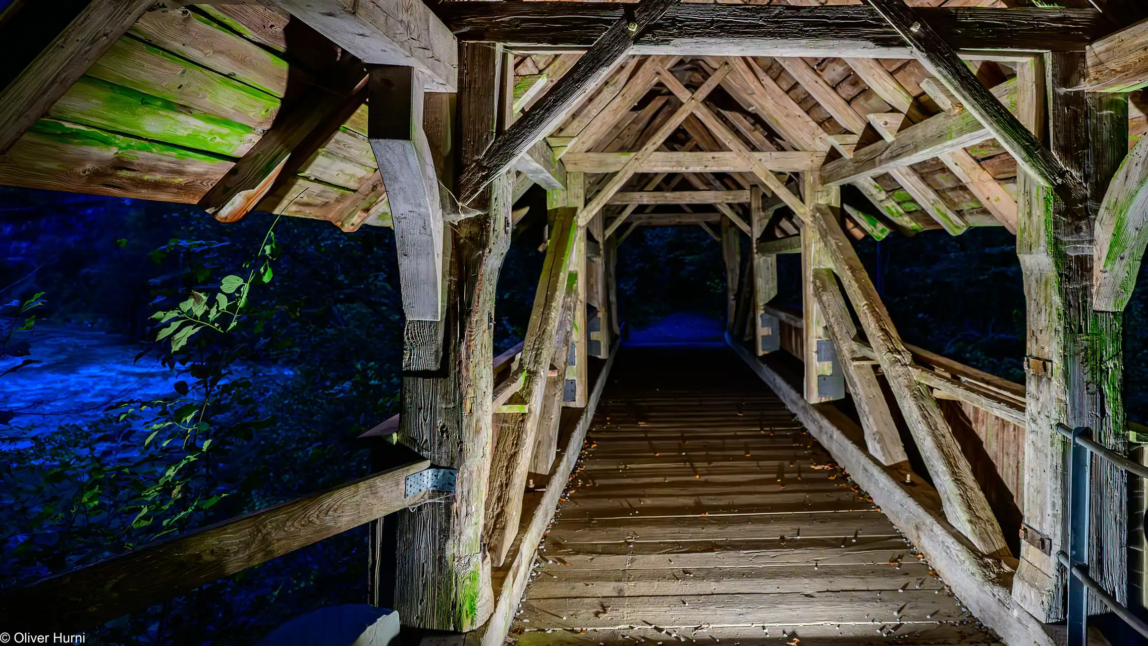 Hier, zwischen den Balken der alten Brücken, entstanden die stärksten Bilder: Lichtbahnen, die durch die Finsternis schnitten, Spiegelungen im feuchten Holz, Silhouetten von Menschen, die wie Geister durch das Dunkel wandelten. Die Kamera wurde zum Medium – nicht nur der Sicht, sondern der Stimmung.